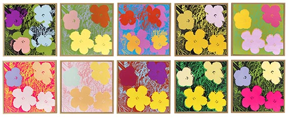 The Flowers portfolio containing 10 large silkscreens in radiant colors by Andy Warhol was published in 1970. The artist discovered the motif in the important year 1964, and he remained preoccupied with the Flowers ever since.